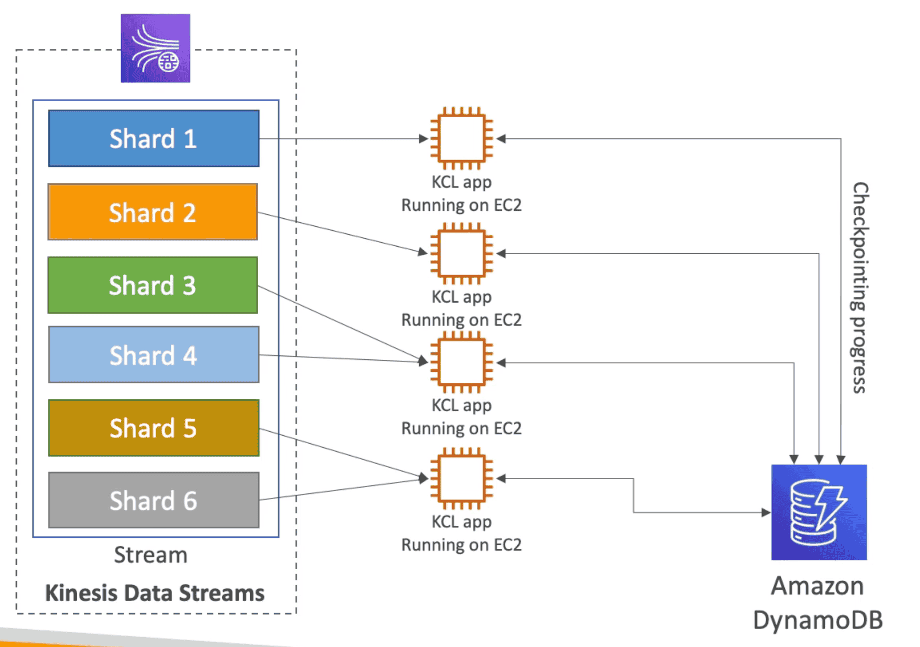 DynamoDB. - Share Workload: Use check points to Track the work among other workers and share the work among other Shard