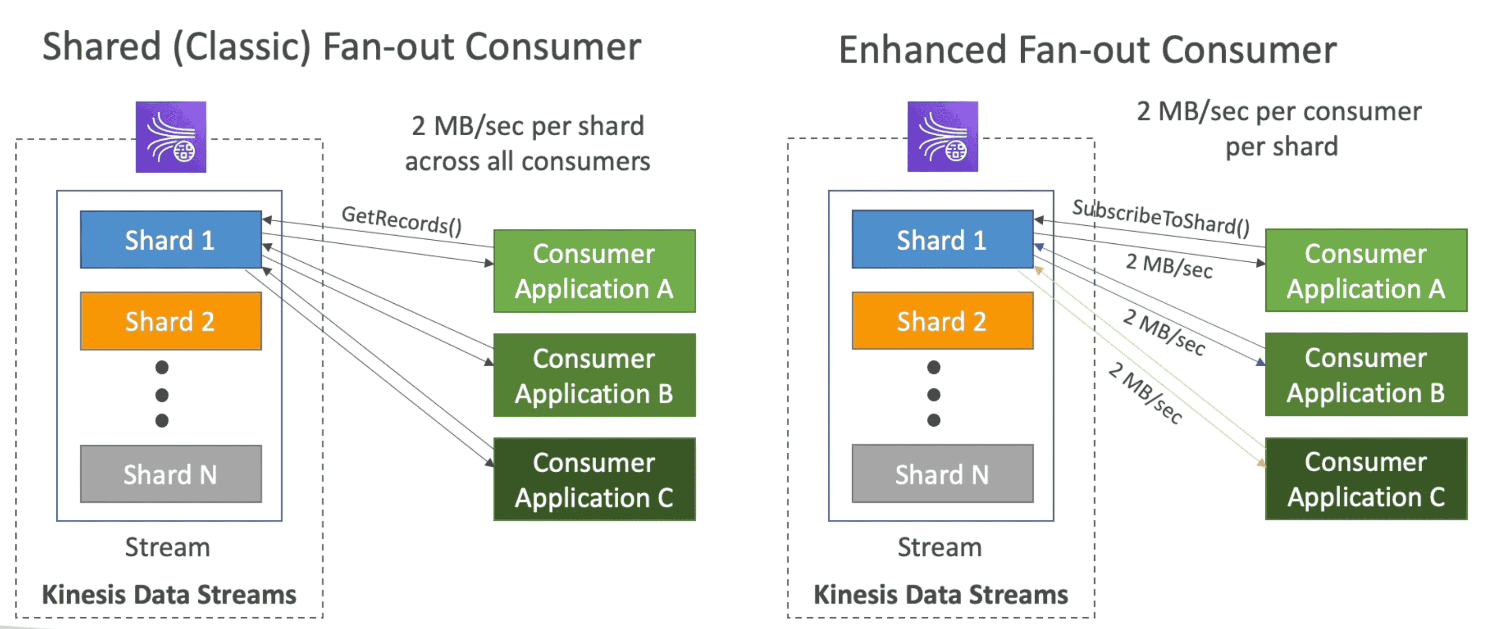 GetRecordsAPI to get data at 2MB/s/all consumer rateSubscribeToShard: Enhanced FanOut Pattern 2MB/s/consumer rate