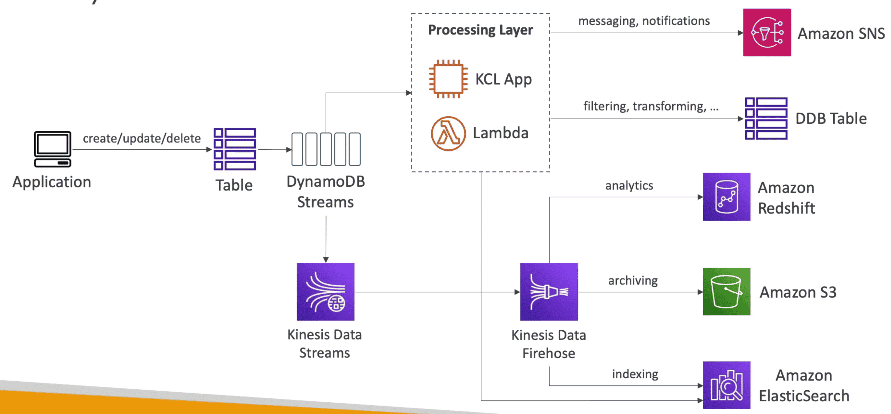 DynamoDB, RDS, Redshift, S3, ElasticSearch, Kinesis, Document DB