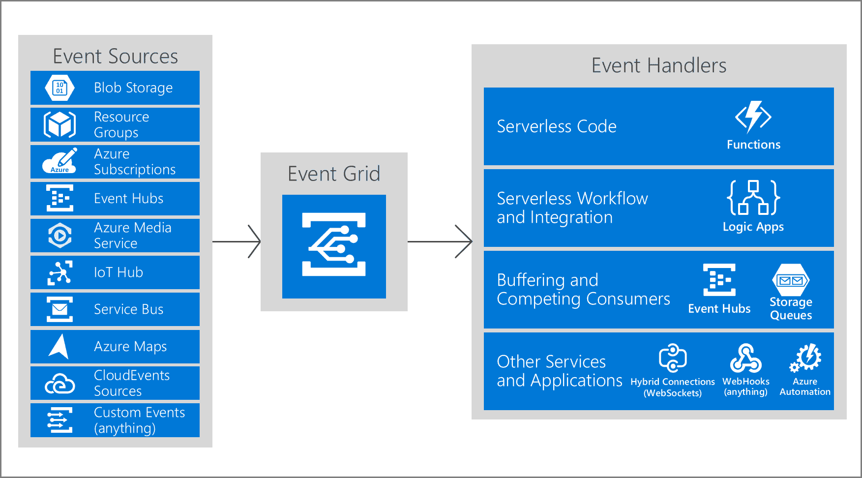 | Event Grid | Reactive programming | Event distribution (discrete) | React to status changes |