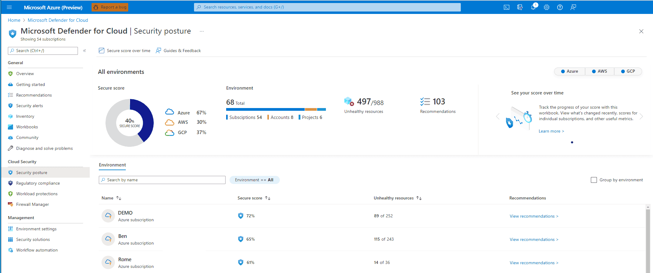 Gives a clear view of security posture based on the implementation of the security recommendations