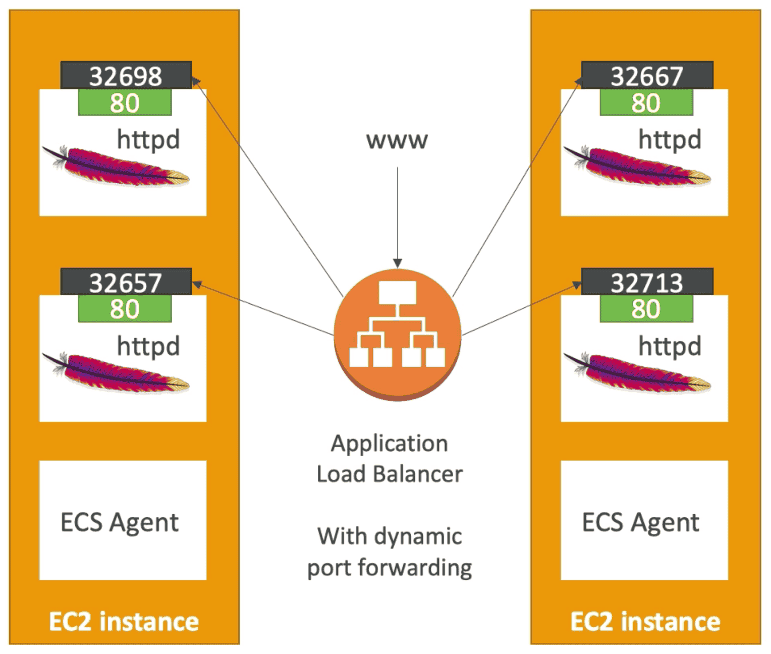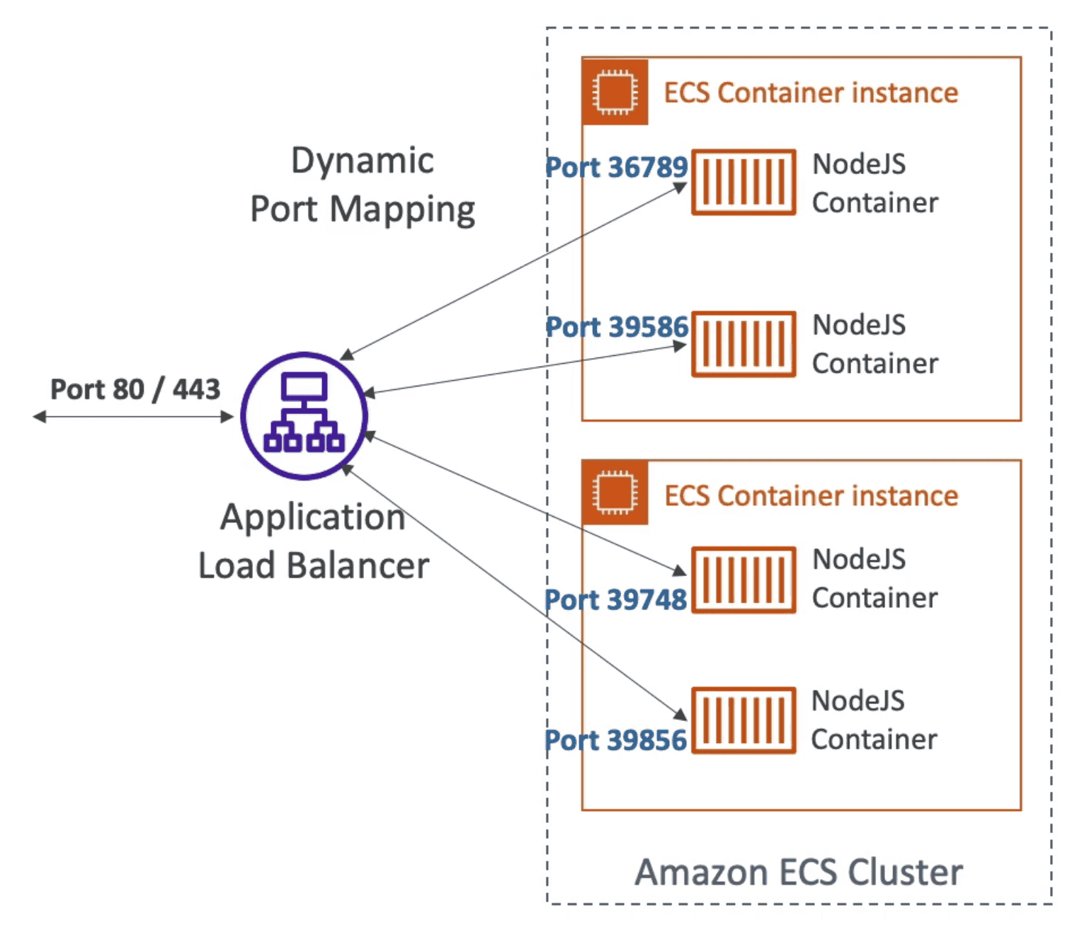 Dynamic Port Forwarding: ALB Automatically find the right port to connect with ECS Cluster- ALB does the load balancing across ECS Containers
