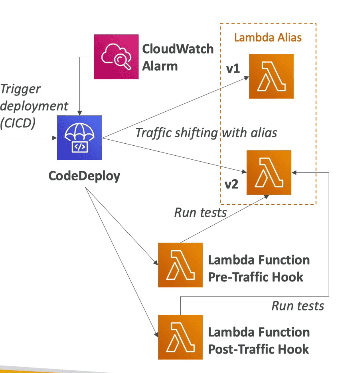 - Post Traffic Hook: RunAnother Lambda function to test V2 after traffic is shifted