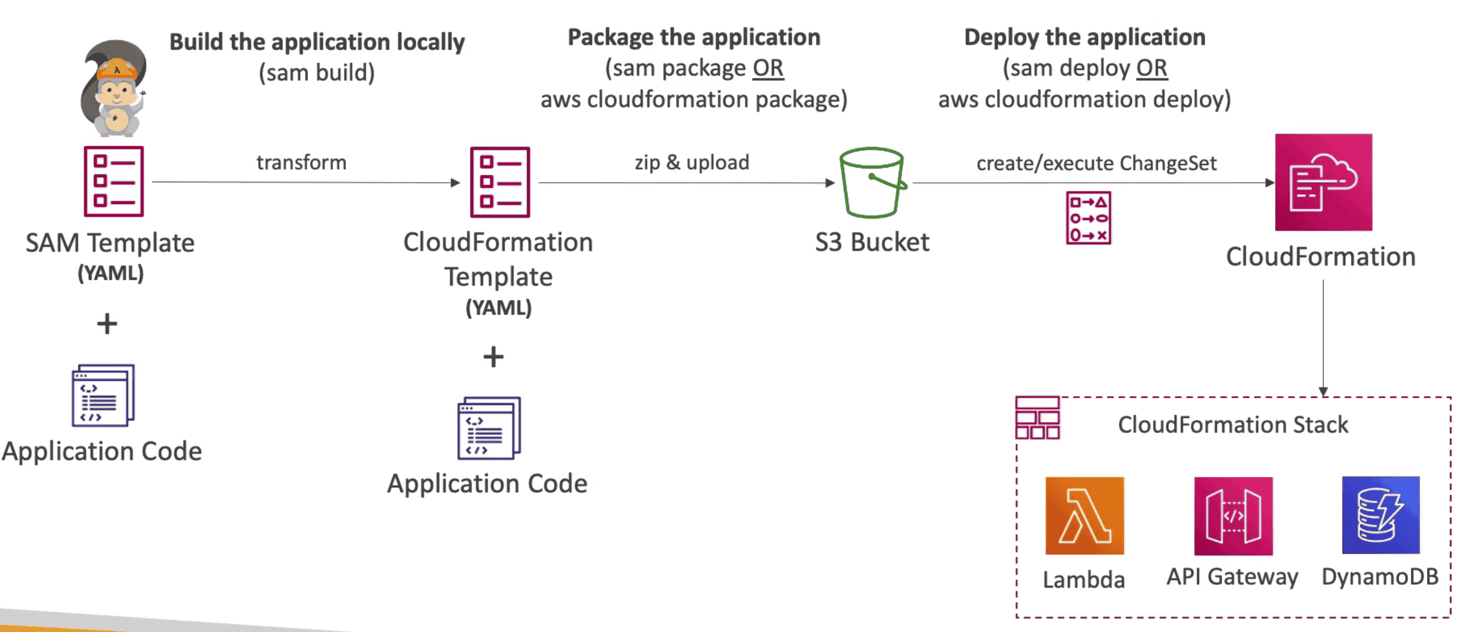 sam package/aws cloudformation package: package & upload to S3 , generate CF Templatesam deploy/aws cloudformation deploy: Deploy to CLoudformation