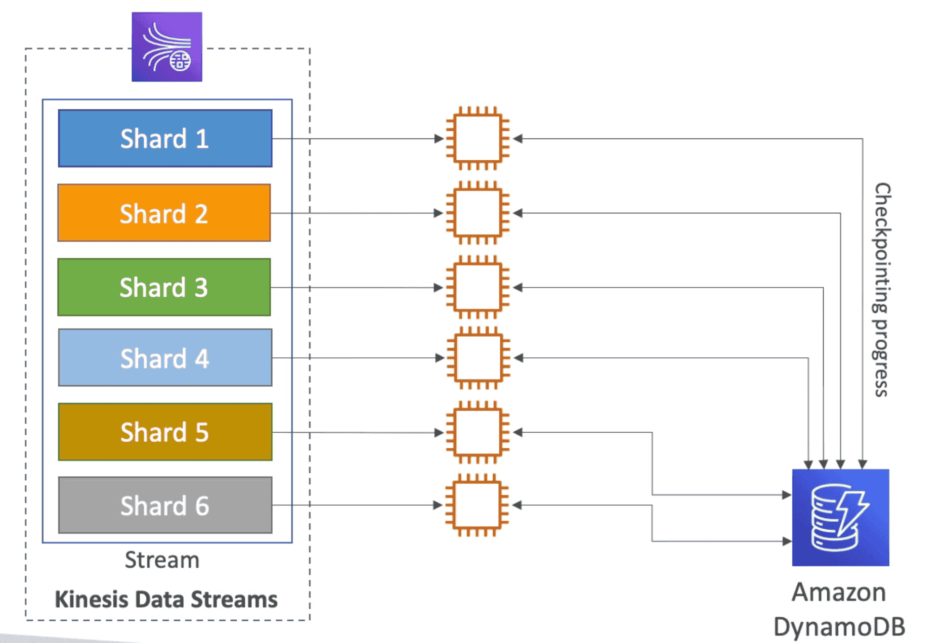 DynamoDB. - Share Workload: Use check points to Track the work among other workers and share the work among other Shard