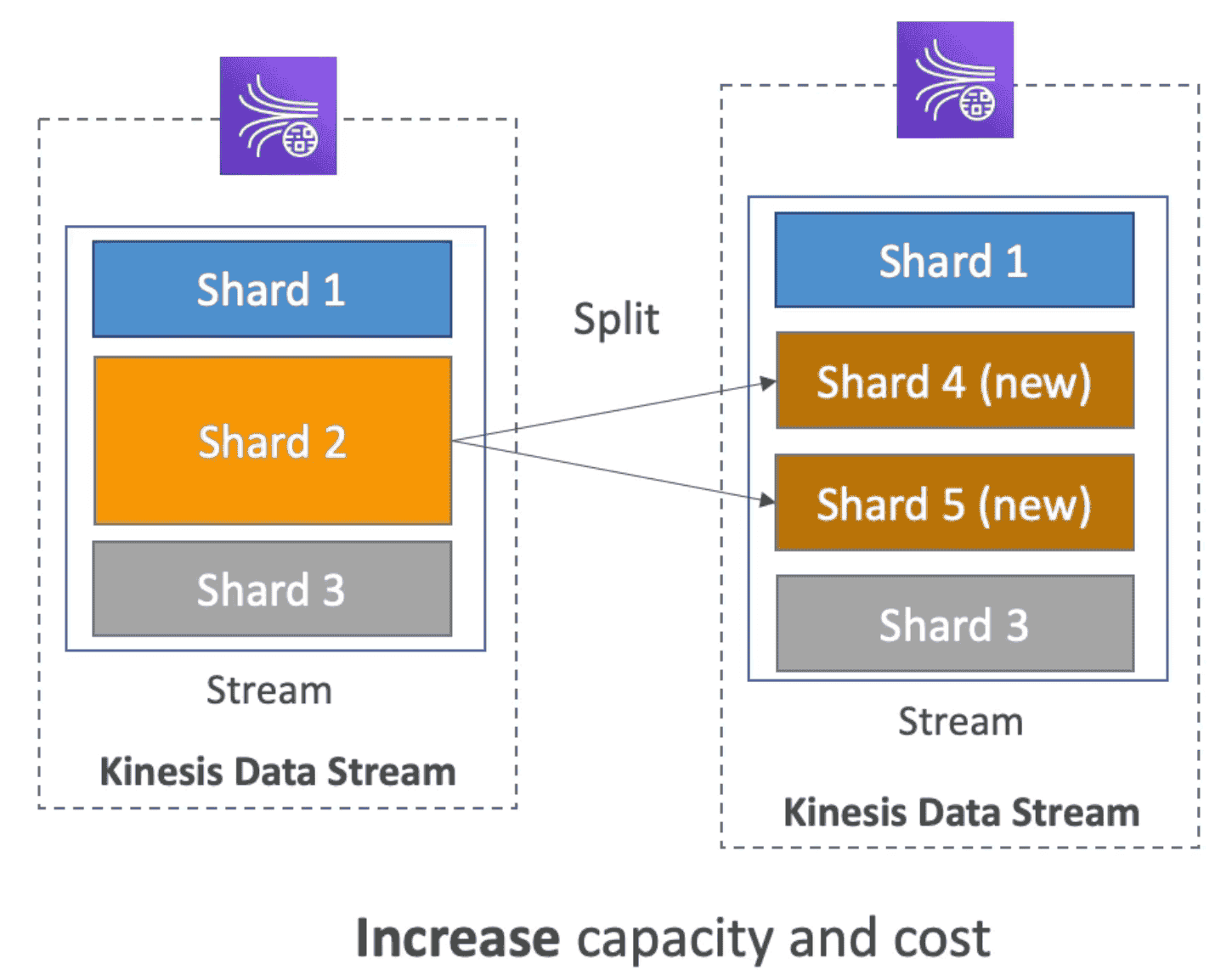Shard Splitting-> increase capacity by increasing shard- Increase capacity by 1MB/Sec but also increase cost