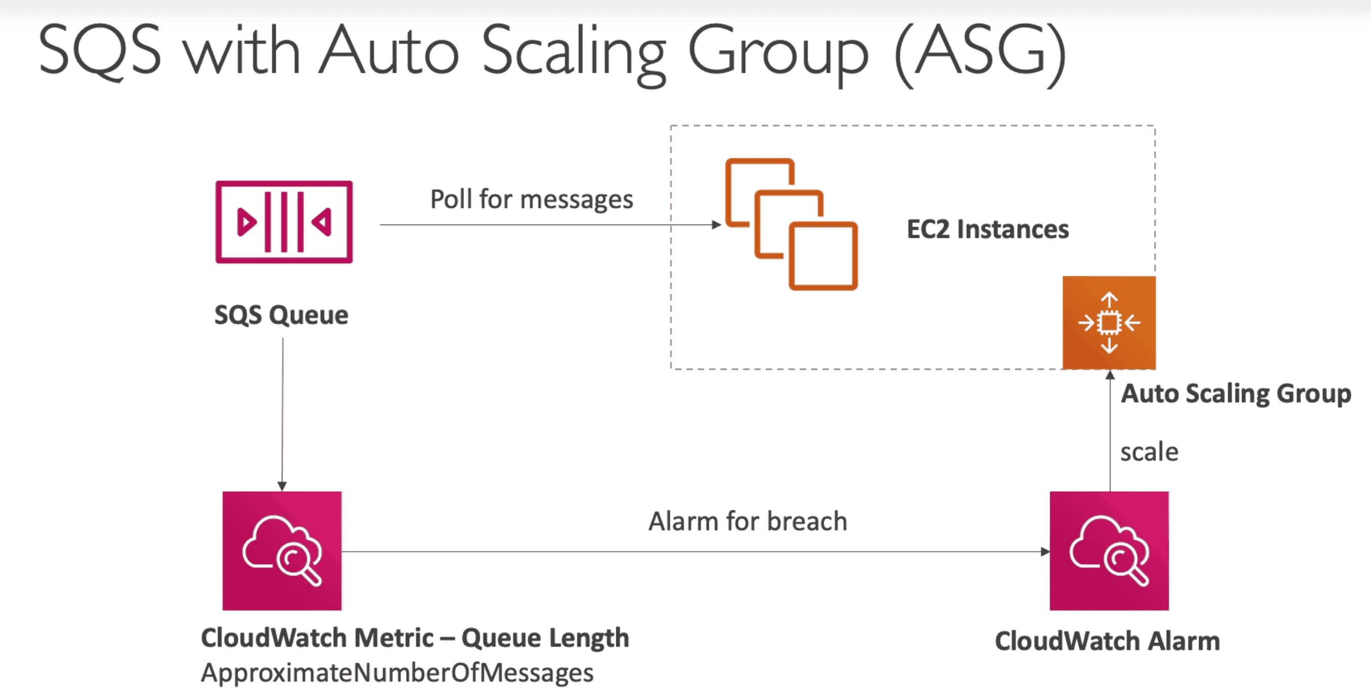 - Cloud watch alarm can be used to scale Consumer based on number of messages in Queue