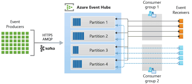 - Real-time and batch processing: EventHubs uses a partitioned consumer model, enabling multiple applications to process the stream concurrently and letting you control the speed of processing.